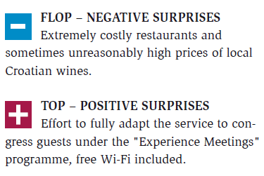 All Radisson hotels share a similar business philosophy and are adapted to the needs of conference guests. Especially likeable is the congress culinary offer, which was named “Brain food”, with only locally grown food and friendly to the health of congress participants. The breakfast is solid and offers a wide selection, only the space is slightly too small for larger groups. The very rich and diverse choice of summer restaurants and bars in the high season is reduced to the Hotel and convention complex. When the weather permits it, the Hotel has some of the finest locations for entertainment and socializing by pools. The staff mostly tries hard but one can also come across some negative surprises, as the number of employees in full-season increases to 500. They have to take care for over 1100 guests, which means that some smaller mistakes can also happen. Their business philosophy “Yes I can” is likable, through which employees are encouraged to meet all desires and wishes of the most demanding guests.