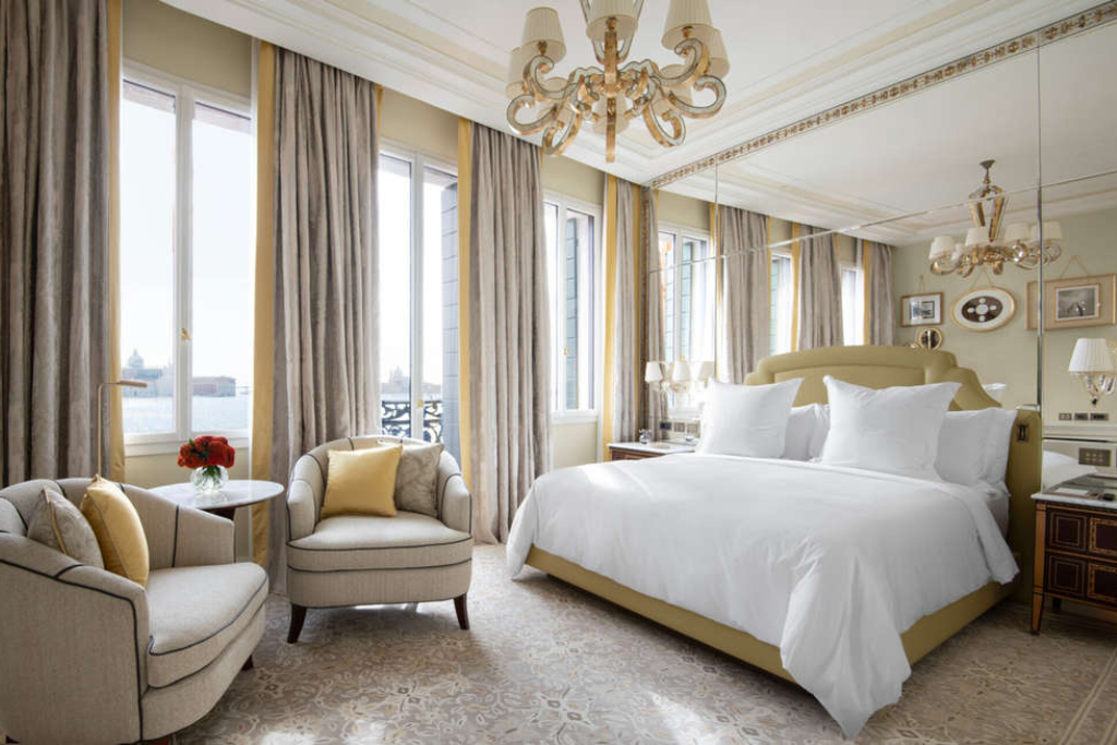 Inspired by the rich history of the three palaces, French designer Pierre-Yves Rochon (Four Seasons hotels in Paris, Cap-Ferrat, Geneva, Milan and Florence, among many others) has transformed the interiors with intelligent use of light through glass and mirrors, and a distinctly Venetian palette of celadon blues and greens, soft pinks, warm golden yellows and rich terracotta. The city’s enduring reputation as a centre of art is showcased in local Rubelli fabrics, Venetian terrazzo, Murano glass and Italian marbles.
